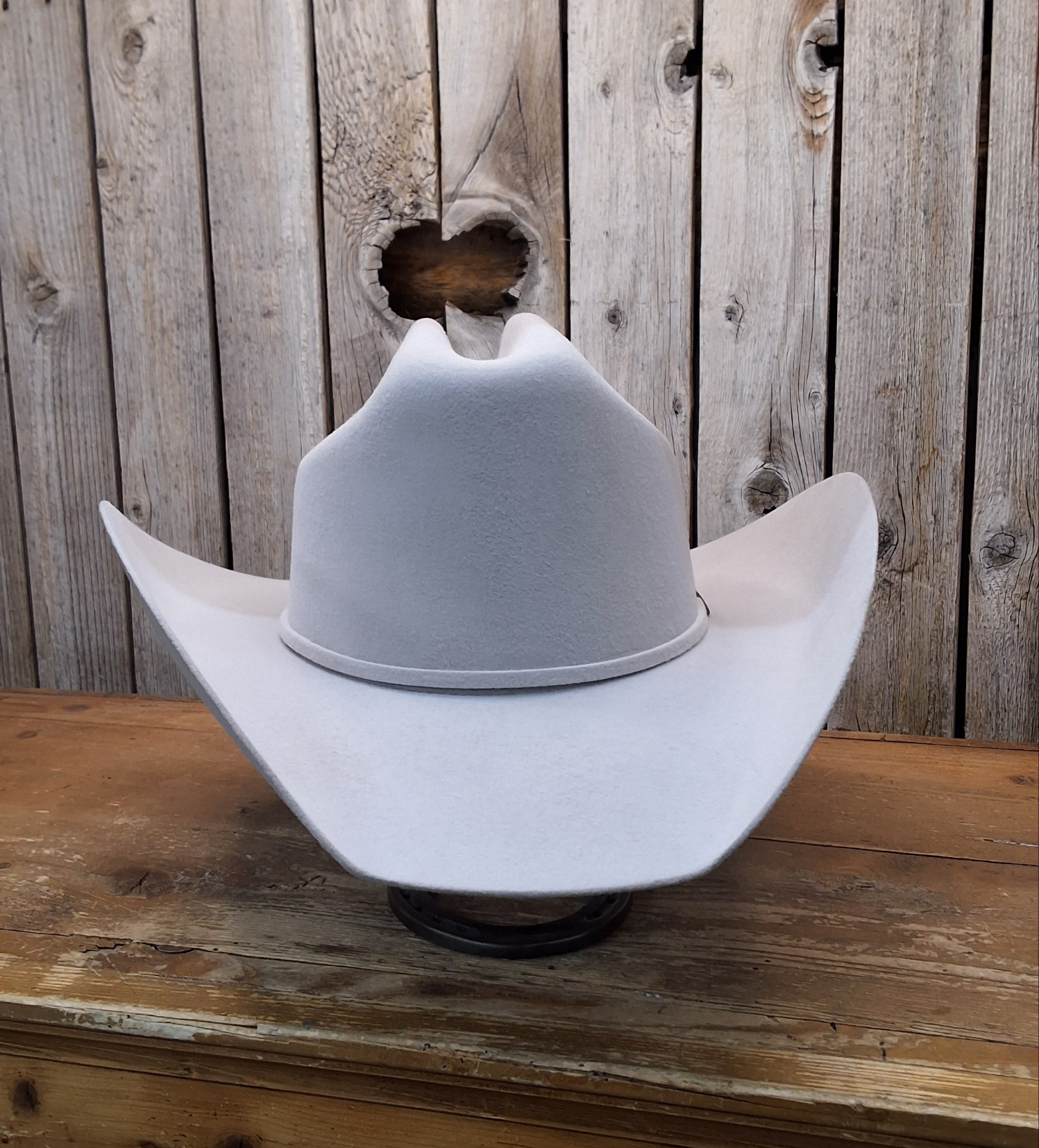 A working cowboy’s crown with a unique lift in the rear—designed for long days, strong looks.