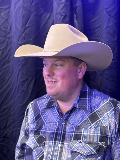 A working cowboy’s crown with a unique lift in the rear—designed for long days, strong looks.